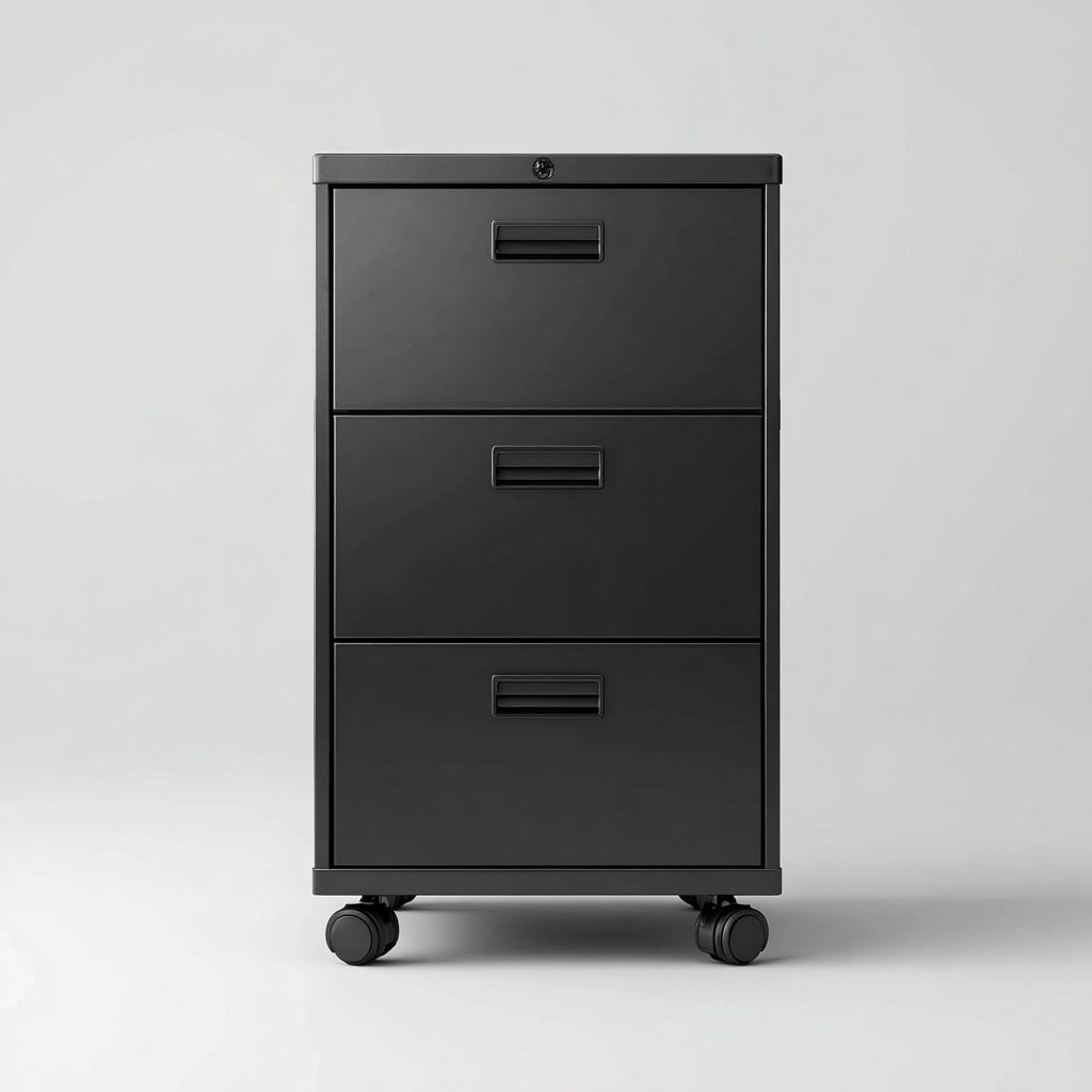Ausgestattet mit drei Schubladen, darunter eine abschließbare Einheit, bietet der Aktenschrank sicheren und großzügigen Stauraum. Die leichtgängigen Rollen ermöglichen ein müheloses Verschieben innerhalb des Arbeitsraums.