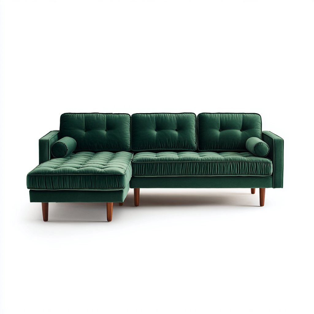 Das Sofa ist mit hochwertigem Samtgewebe in kräftigem Grün bezogen. Die Polsterung ist angenehm weich und sorgt für ein komfortables Sitzgefühl. Die stabilen Holzfüße bieten zuverlässige Unterstützung und einen harmonischen optischen Kontrast.