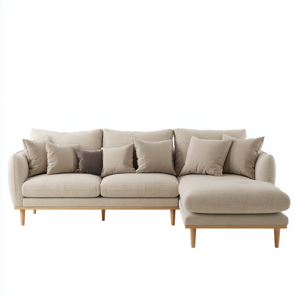 Die breite Sitzfläche und die sanfte Polsterung ermöglichen entspanntes Sitzen über längere Zeit. Das moderne Design mit schlanken Holzfüßen verleiht dem Wohnzimmer einen warmen und natürlichen Charakter.
