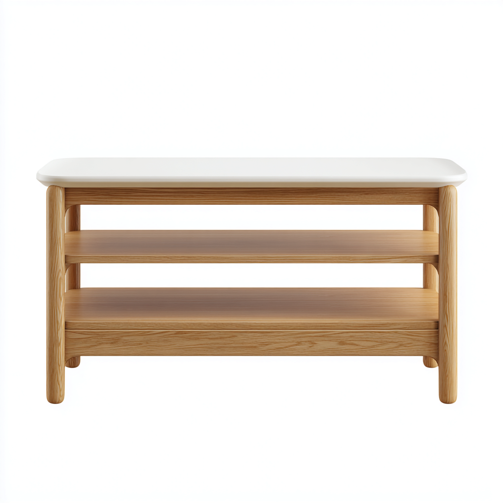 Das Lowboard verfügt über eine stabile Holzstruktur in Naturfarbe mit einer glatten weißen Oberplatte. Die abgerundeten Kanten und die sorgfältige Verarbeitung verleihen dem Möbelstück eine hochwertige und moderne Ausstrahlung.
