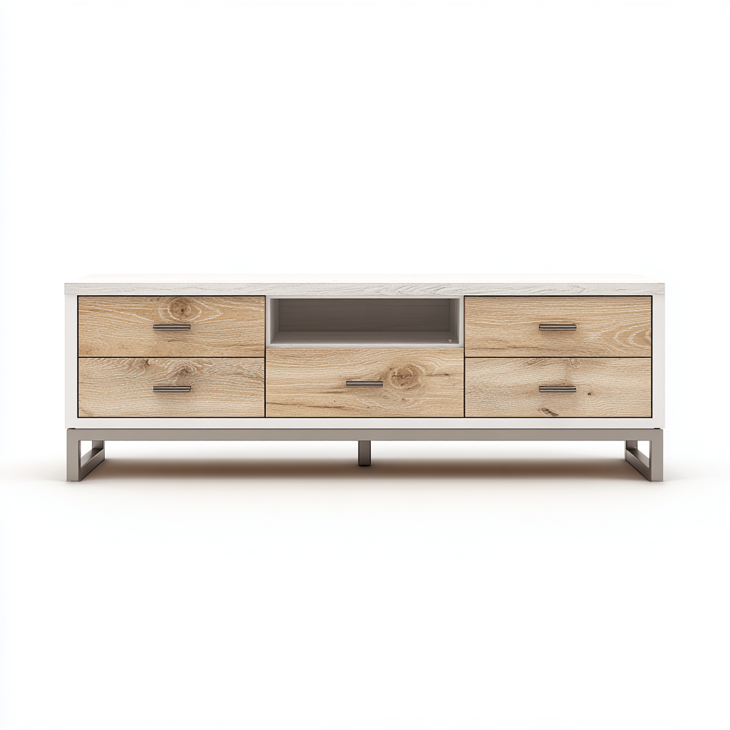 Das offene Mittelteil eignet sich ideal für Geräte, die schnellen Zugriff benötigen, während die geschlossenen Elemente eine ordentliche Aufbewahrung unterstützen. Das stabile Metalluntergestell sorgt für zusätzliche Standfestigkeit.