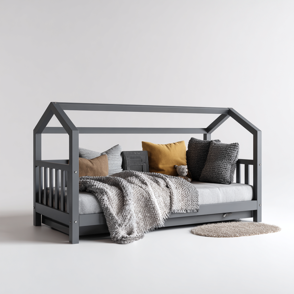 Dieses moderne Kinderbett im Hausbett-Stil schafft eine gemütliche Schlafumgebung und einen stilvollen Blickfang im Kinderzimmer. Das offene Dachgestell wirkt einladend und fördert eine wohnliche Atmosphäre.