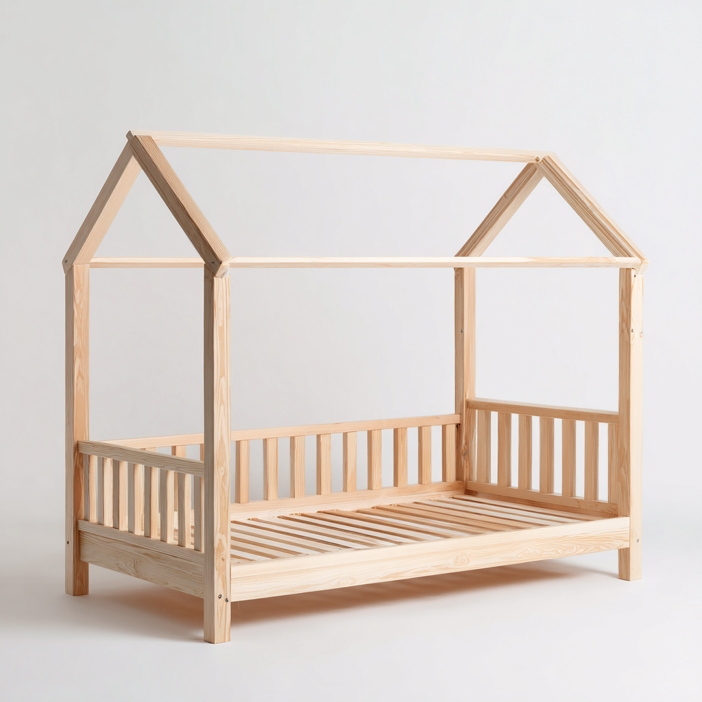 - 1 x Kinderbett aus Naturholz mit Hausrahmen