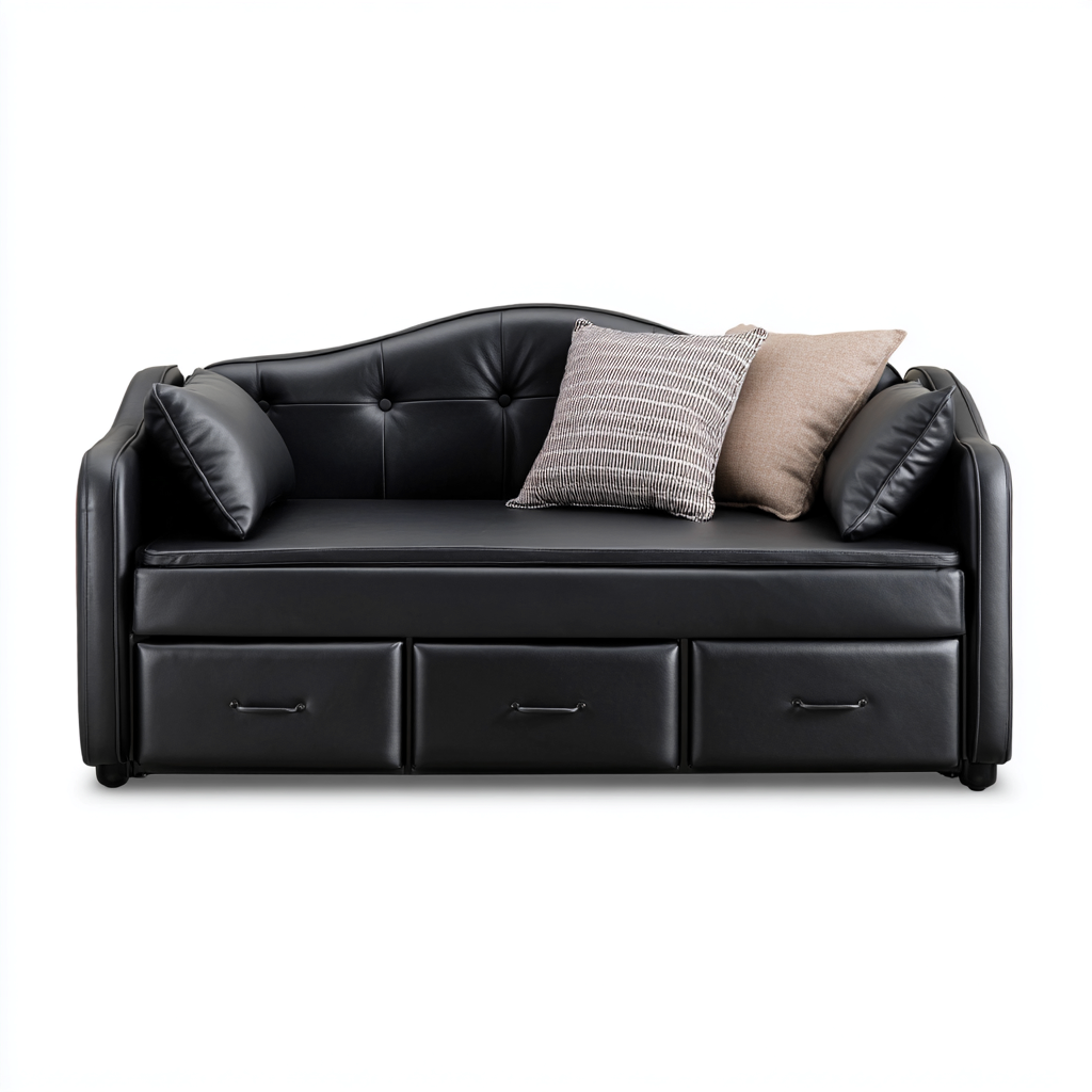 Dieses Schlafsofa überzeugt durch seine moderne Kunstlederoberfläche und eine kompakte Form, die ideal für Schlafzimmer oder Gästezimmer geeignet ist. Die strukturierte Rückenpartie und die klare Linienführung verleihen dem Möbelstück ein elegantes Erscheinungsbild.