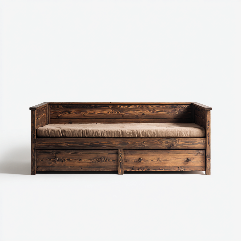 Dieses Schlafsofa aus massivem Holz präsentiert sich in einem rustikalen Stil und bietet eine stabile Sitz- und Liegefläche. Die warme dunkelbraune Farbgebung sorgt für eine wohnliche Atmosphäre und macht das Möbelstück ideal für Schlafzimmer oder Gästezimmer.