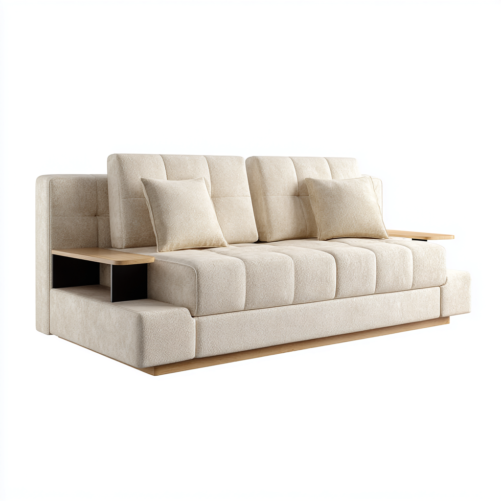 Das Modell verfügt über seitliche Ablageflächen, die eine praktische Abstellmöglichkeit für Alltagsgegenstände bieten. Die breite Sitzfläche ermöglicht vielseitige Nutzung als Ruhe- oder Sitzbereich.