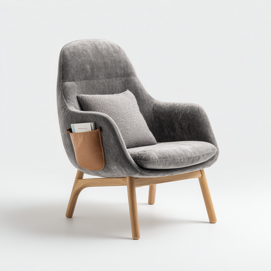 Dieser moderne Sessel kombiniert weichen grauen Stoff mit einem stabilen Holzgestell und fügt sich harmonisch in verschiedene Wohnzimmerstile ein. Die ergonomische Form sorgt für hohen Sitzkomfort und eine entspannte Haltung.