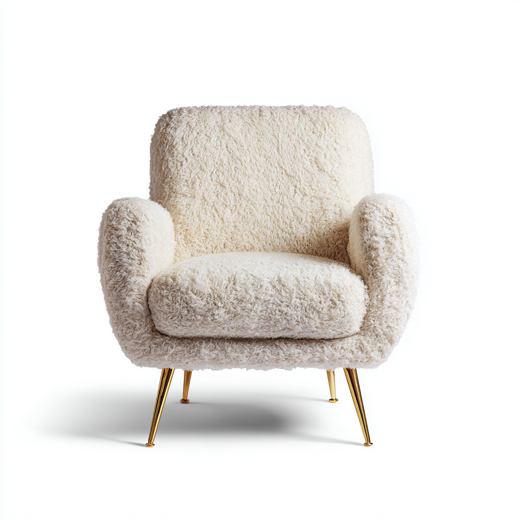 Der Sessel verfügt über einen weißen, weichen Stoffbezug mit flauschiger Struktur. Die filigranen Beine bestehen aus Metall in goldfarbener Ausführung und sorgen für einen stabilen Stand.