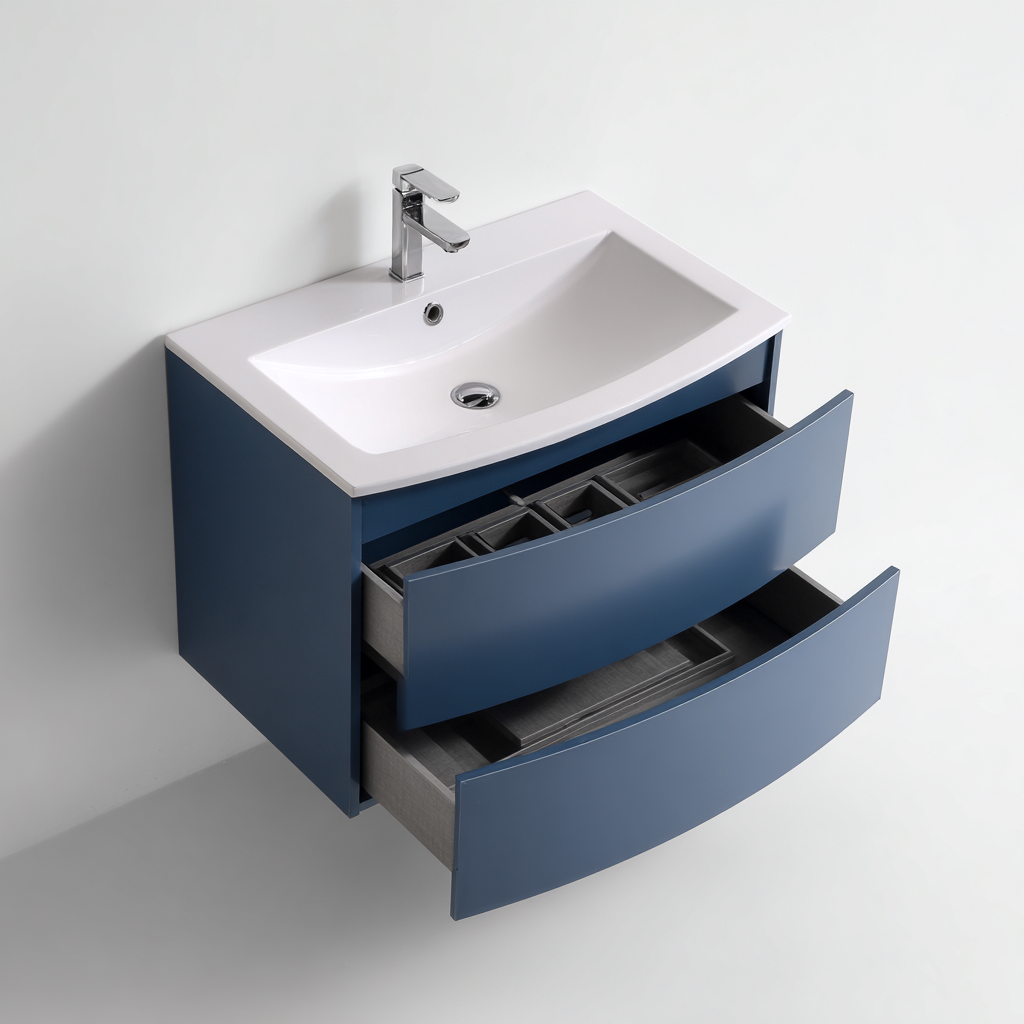 Der Korpus besteht aus robustem, pflegeleichtem Holzwerkstoff in Blau, der sich gut für feuchte Badezimmerumgebungen eignet. Das Waschbecken ist aus weißer Keramik gefertigt, langlebig und leicht zu reinigen. Die Schubladen verfügen über leise und stabile Führungsschienen.