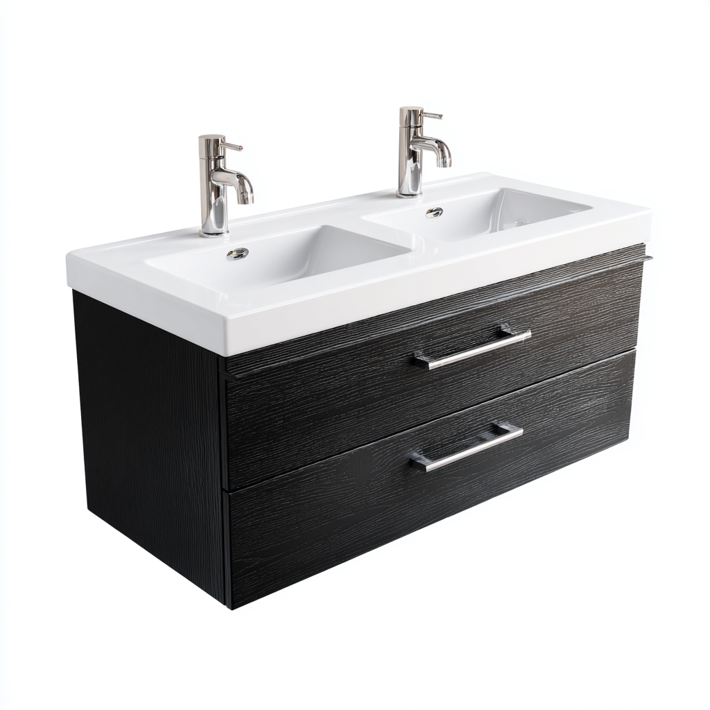 Gefertigt aus strapazierfähigem MDF mit schwarzer Holzoptik sowie einer pflegeleichten Keramik-Doppelwaschschale. Die hochwertigen Metallgriffe sorgen für eine stabile und komfortable Handhabung.