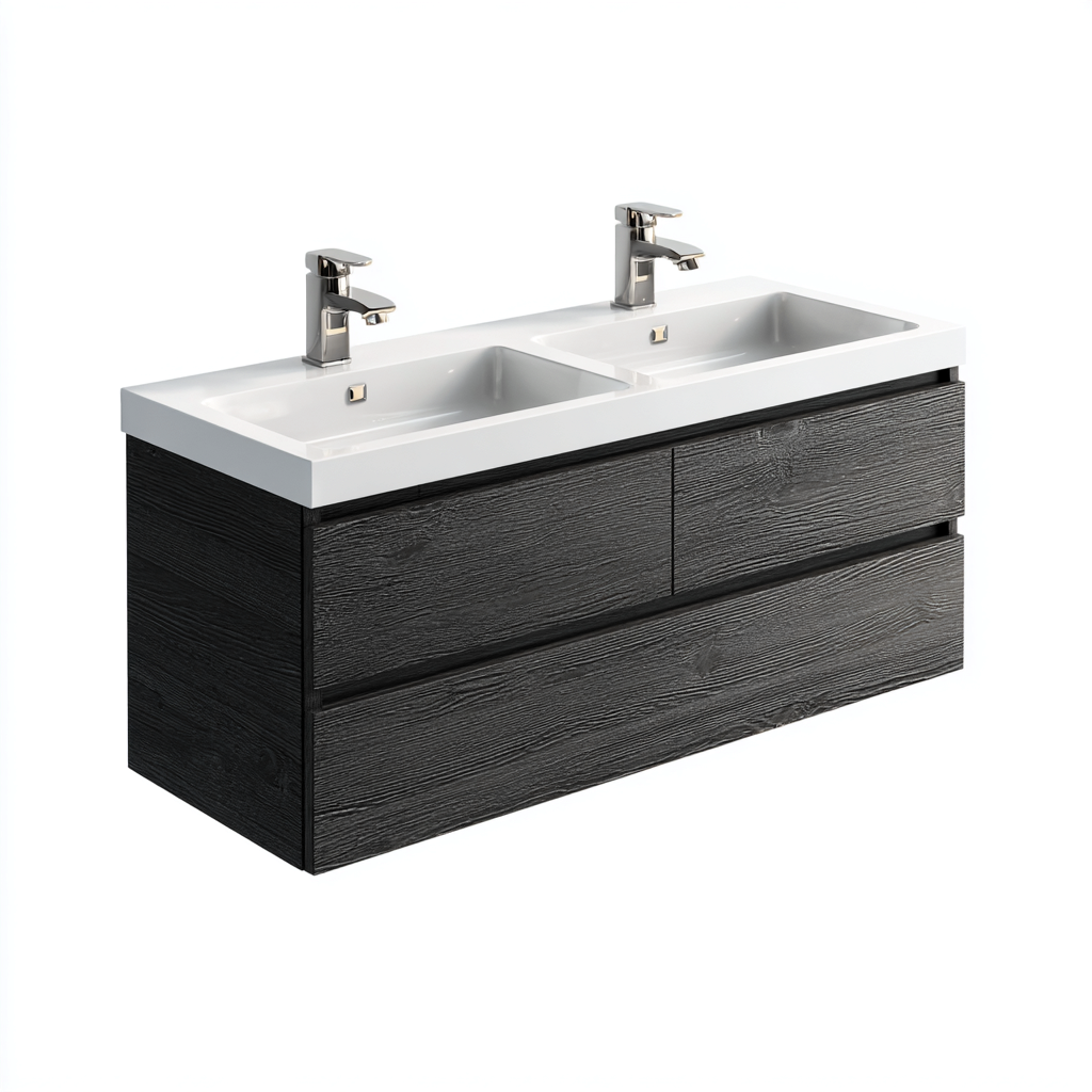 Dieser moderne Waschtisch mit Doppelwaschbecken verbindet minimalistisches Design mit hoher Funktionalität. Die schwarz strukturierte Oberfläche sorgt für eine stilvolle, zeitgemäße Optik und passt in verschiedenste Badezimmerstile.